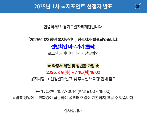 2025년 1차 경기도 청년복지포인트 선정자 발표가 7월 9일(수) 오전 11시에 완료되었습니다. 주요 내용과 절차를 정리해 드립니다.